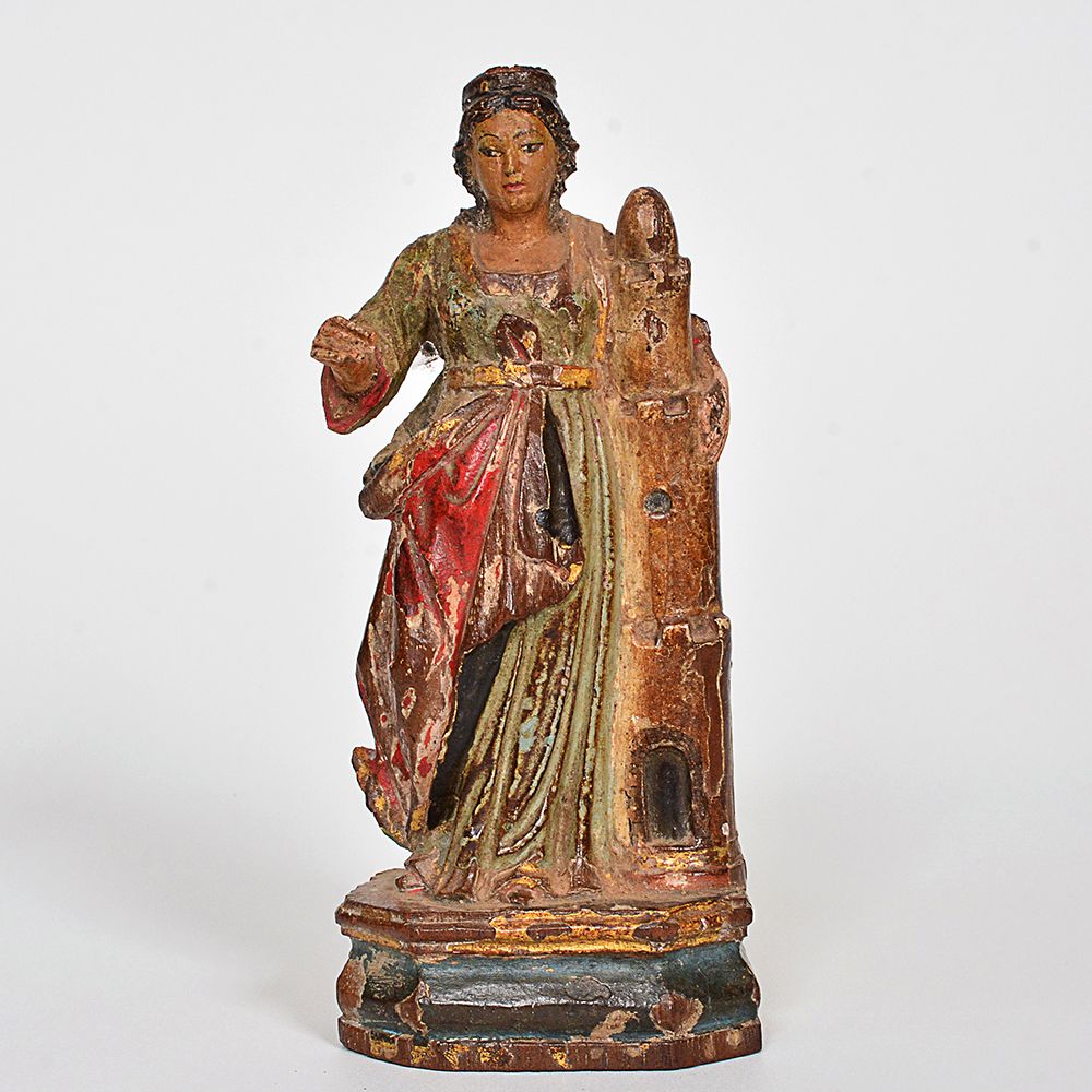 Artista Não informado Título Sem Título Técnica Objeto Descrição Imagem de Santa Bárbara em madeira entalhada e policromada, apoiada sobre base octogonal. Alt. 17 cm -Crédito da imagem: https://br.dagsaboya.com.br/peca.asp?ID=27902689&ctd=4 - Texto transcrito do catálogo do leilão. - Esta obra entrou em leilão com o lance inicial de R$2.000,00 Avaliação da Obra Somente para Assinantes Fonte de Pesquisa Somente para Assinantes Data da Pesquisa 03/11/2025