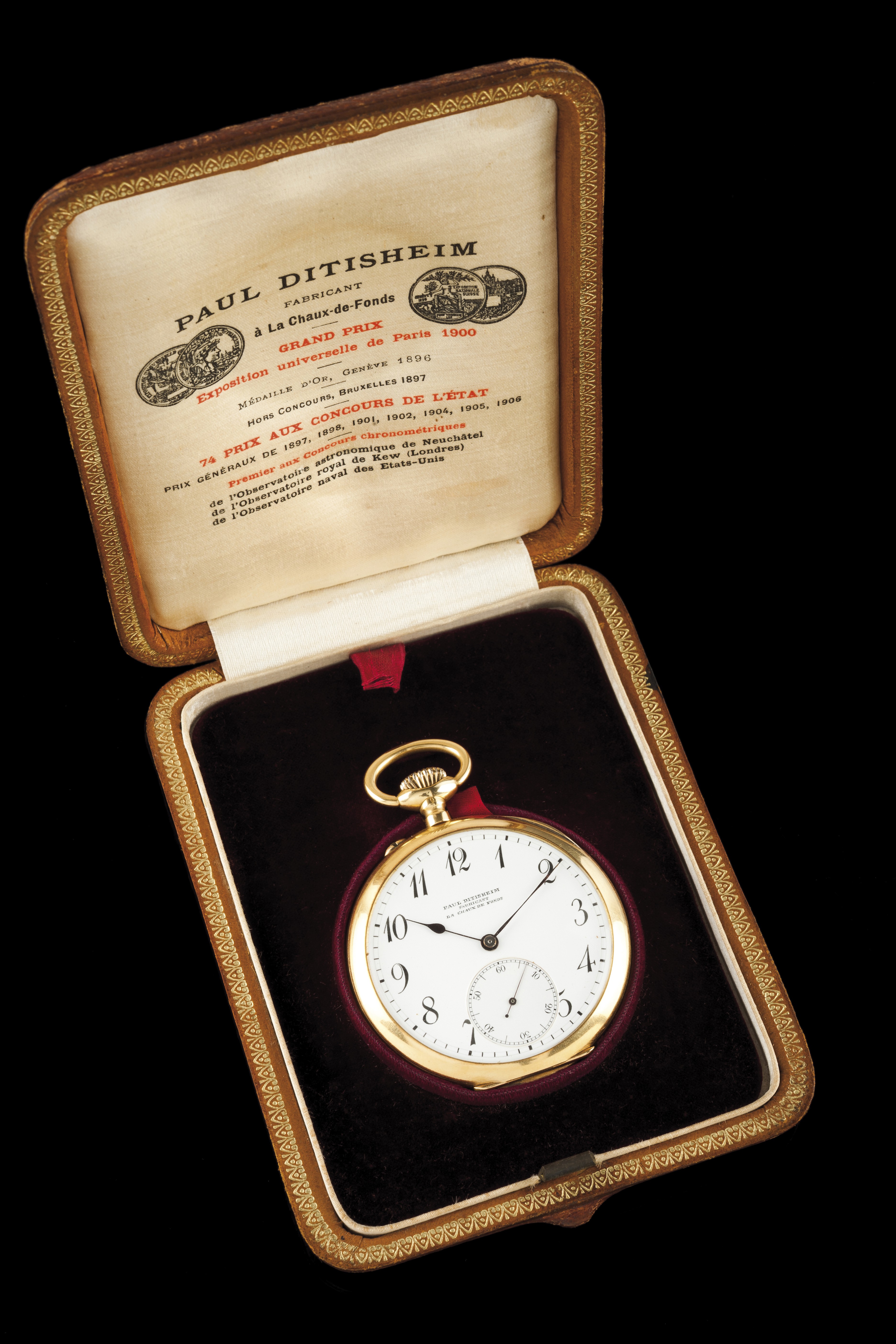 Título Relógio de Bolso Descrição Relógio de bolso marca Paul Ditisheim. Movimento mecânico de corda manual. Caixa em ouro (750) com inscrição "medaille d'or Genéve 1896". Mostrador sem depreciativos. Acompanha estojo original. Em bom estado de conservação. 50 mm 72,4g (total) Avaliação do Item Somente para Assinantes Fonte de Pesquisa Somente para Assinantes Data da Pesquisa 17/07/2019