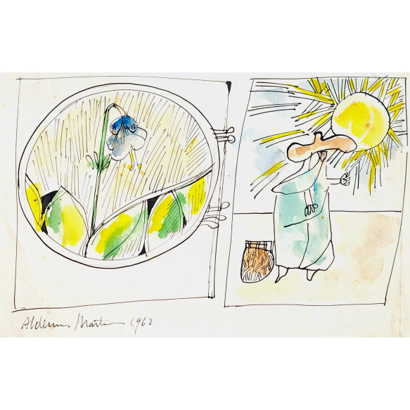 Artista Aldemir Martins Título Flor e rendeira ao sol Técnica Nanquim e aquarela sobre papel Ano 1962 Década 60 Século 20 Dimensões 22 cm x 14,5 cm Descrição Aldemir Martins - Flor e rendeira ao sol. Nanquim e aquarela sobre papel, 14,5x22 cm, 1962, A.C.I.D. Sem moldura, com certificado de autenticidade do Estúdio Aldemir Martins -Crédito da imagem: https://www.iarremate.com/cukier_arte/033/18 - Texto transcrito do catálogo do leilão. - Esta obra entrou em leilão com o lance inicial de R$890,00 Avaliação da Obra Somente para Assinantes Fonte de Pesquisa Somente para Assinantes Data da Pesquisa 07/10/2025
