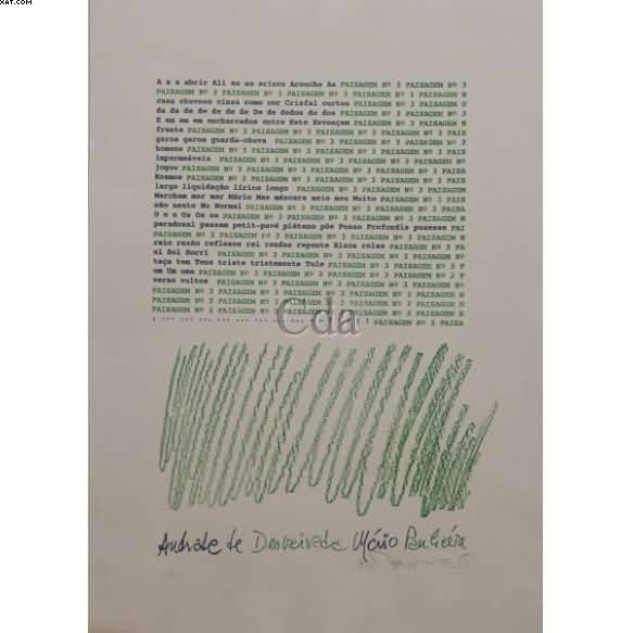 Artista Nelson Leirner Título Andrade de Desvairada Mário Paulicéia Técnica Litografia Ano 1992 Década 90 Século 20 Dimensões 50 cm x 70 cm Descrição Somente para Assinantes Avaliação da Obra Somente para Assinantes Fonte de Pesquisa Somente para Assinantes Data da Pesquisa 26/07/2016