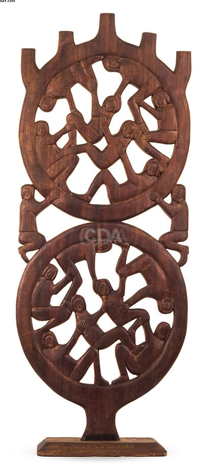 escultura em madeira entalhada, ass. no verso da base. 51 x 21 x 11 cm - Texto transcrito do catálogo do leilão. - Esta obra entrou em leilão com o lance inicial de R$800,00